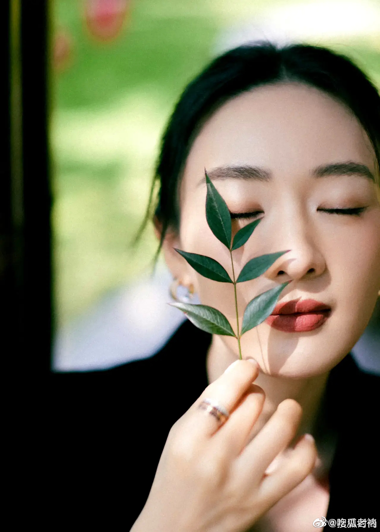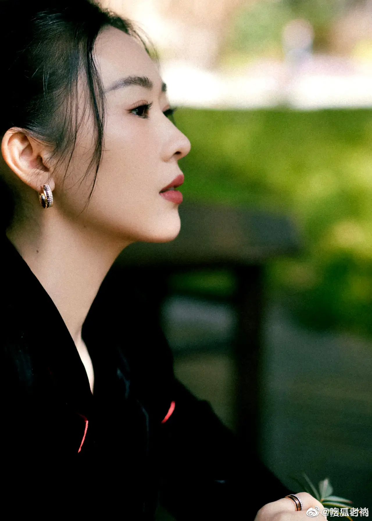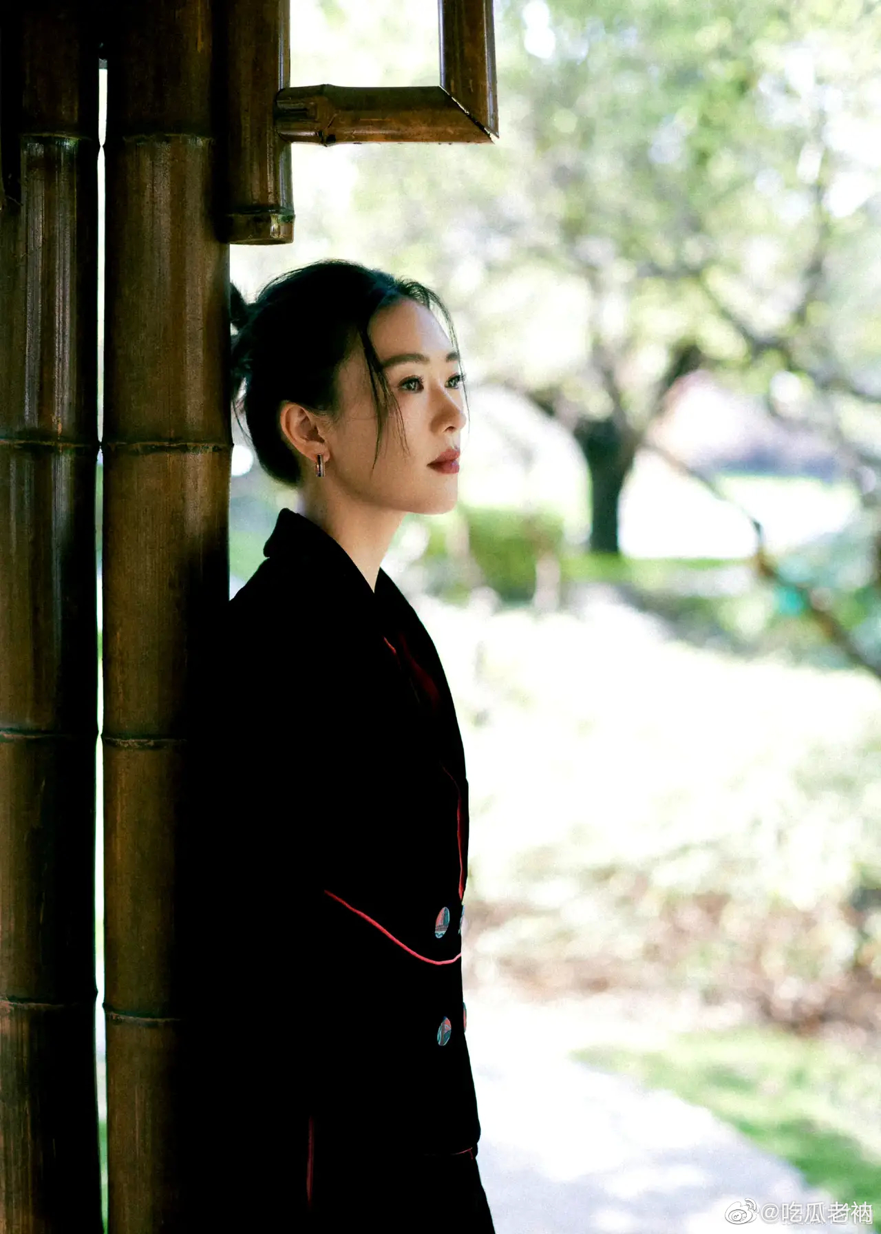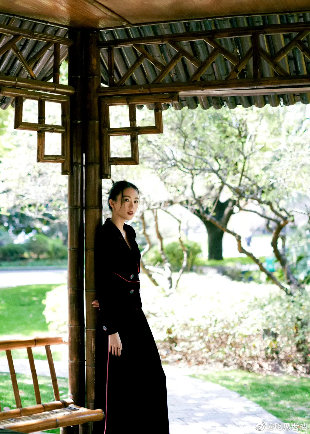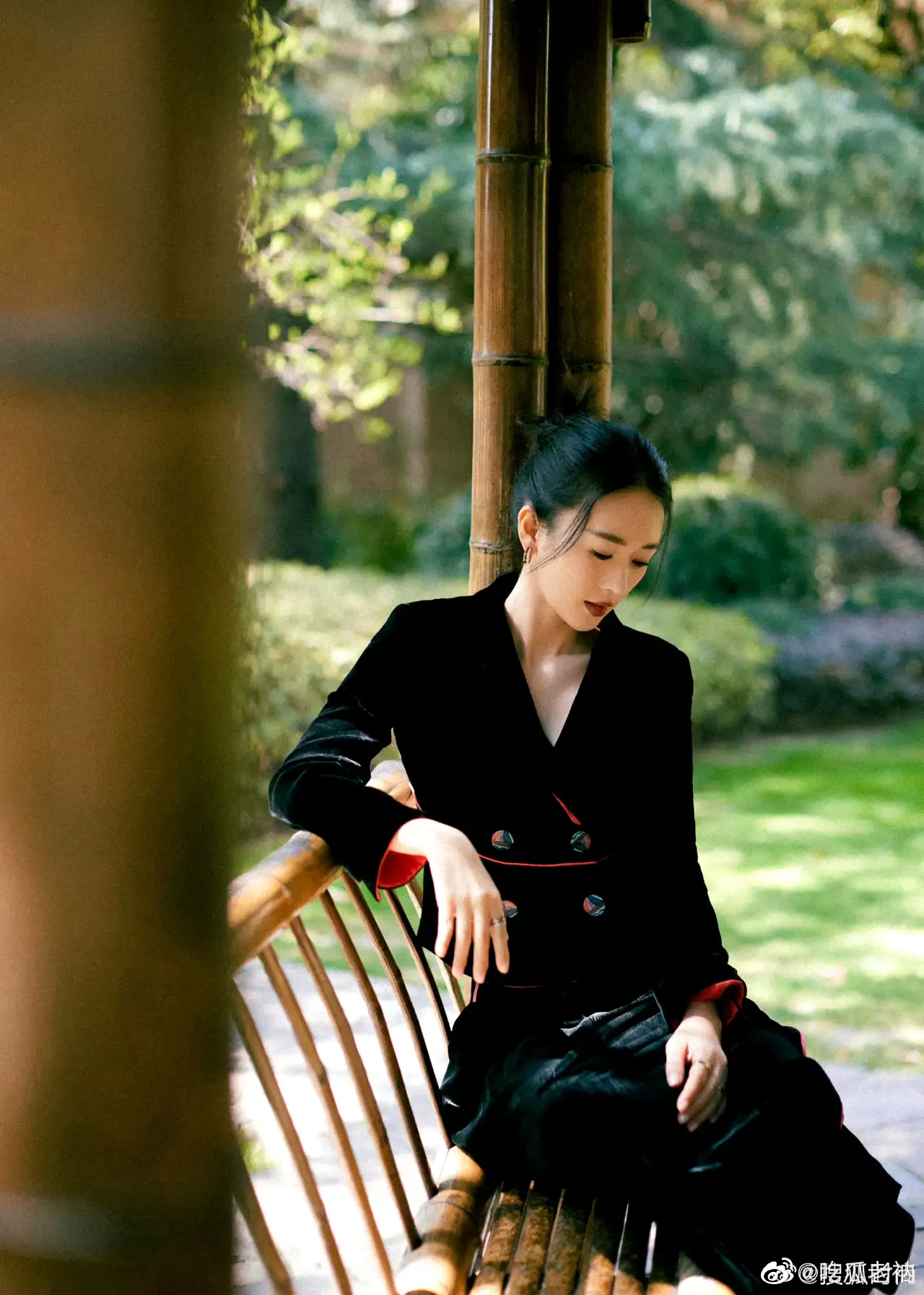 童瑶 出席活动造型,一身黑西装套裙倚靠在园林长椅上,仪态好绝,中式风格真的很抓人 ???#童瑶仪态#