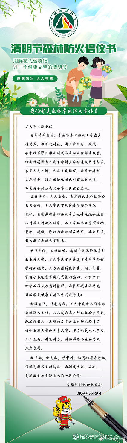 每年清明前后,是我市森林防火工作最关键时期。每年这时候,因上坟焚香、烧纸、燃香烛等野外用火引发的森林火灾时有发生,给森林资源和人民生命财产安全造成严重危害。当下天气干燥,大风天气频发,为有效保护生态安全,防止因祭祀用火引发森林火灾,市园林和林业局向全市人民发出倡议。