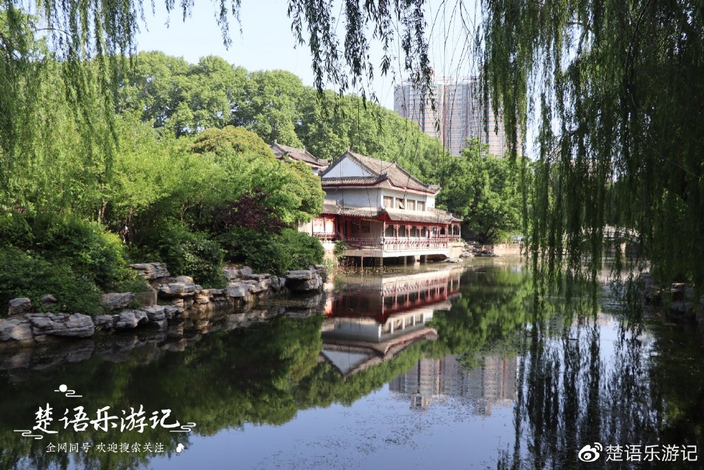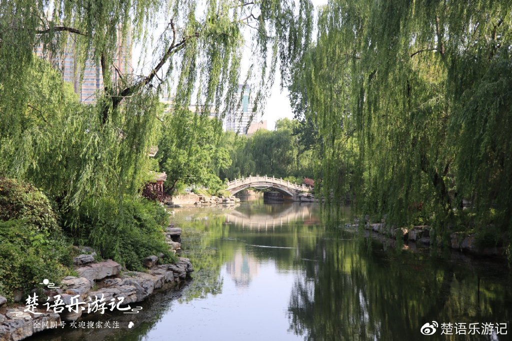 公园以湖景为中心,是一处江南园林式公园。园中湖泊与小桥相映,湖中有岛,岛上有绿树和凉亭,湖水四周是茂林修竹,树木葱茏,古槐参天,置身园中有移步换景之感,游人如潮却不显喧嚣,甚至有几分幽静之感。