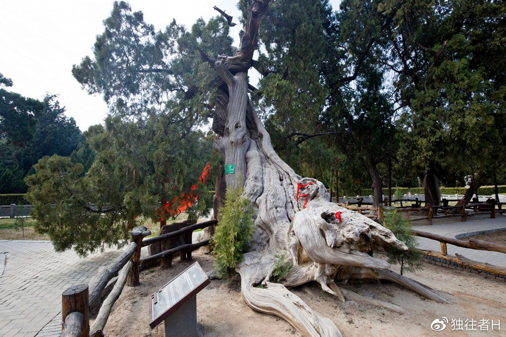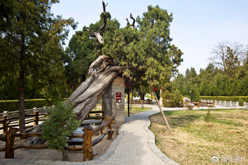 走过舜帝抚琴像,其背后就是舜帝陵的外城,也叫神道入口,这是个半圆形的“古柏广场”,是大型的祭祀活动的地方。这里有两组千年古柏,相传是大禹亲手为舜帝所种植,已有四千多年的历史了。其中一组为“活柏抱死柏”,明朝地方志称它为“连理柏”,它们相互依偎,就像一对夫妻表达了对爱情的忠贞不渝,于是当地老百姓给它们取了个好听的名字叫“夫妻柏”。