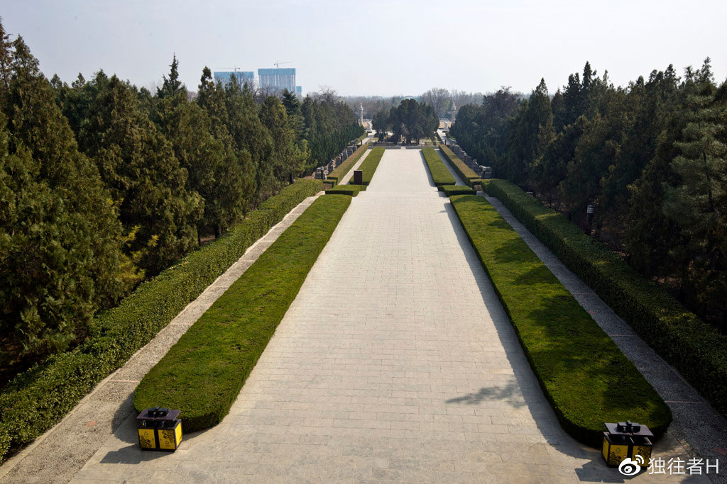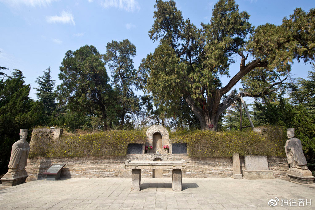 穿过享厅,便见到砖砌的方形墓冢,陵高3米,周围51米。陵前有二尊石像生守护,陵冢上槐柏交翠,郁郁葱葱,整座陵冢庄重肃穆。