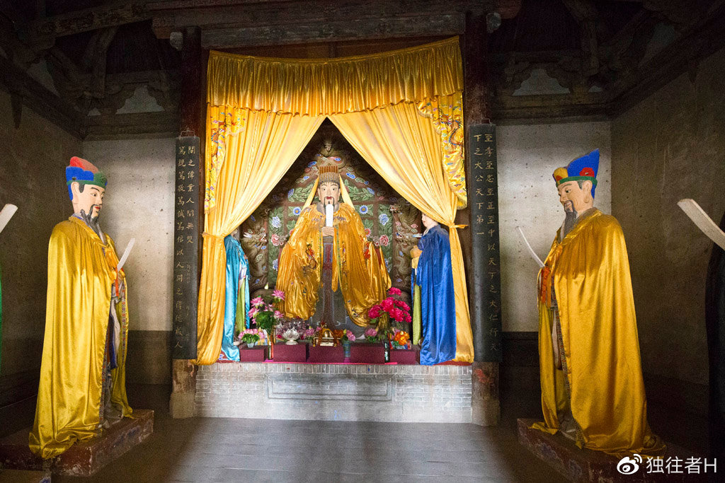 皇城,绕陵北行约三十米,即是皇城。皇城,又名离乐城。进拱形城门,内以戏楼、卷棚、献殿、正殿、寝宫为中轴线,东西两侧配以廊房及钟、鼓二楼,构造布局严谨,左右对称。主建筑正殿,建造于台基之上,重檐歇山顶,斗拱五铺作,面阔五间,进深五椽。殿内泥塑的舜帝坐像,头戴冕旒,身着衮服,神态庄严,栩栩如生。