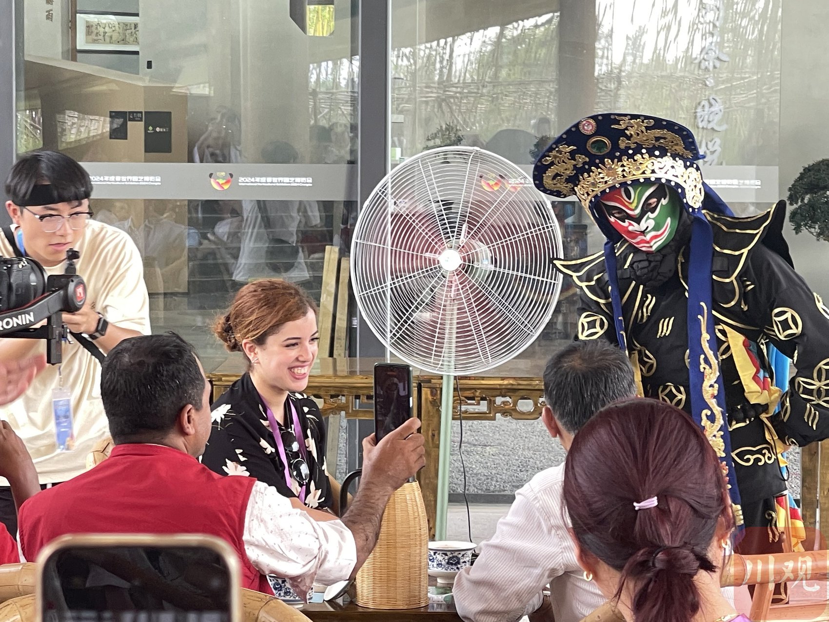 参观结束后,采访团一行还特意来到了主会场内的天府人居馆欣赏了川剧变脸和长嘴壶茶艺表演。