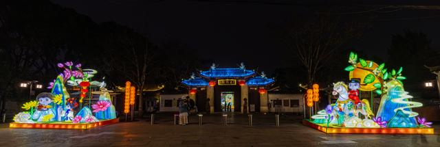 走入古猗园南门,游客的视线立即聚焦到一组颇具创意的自贡彩灯景观上。